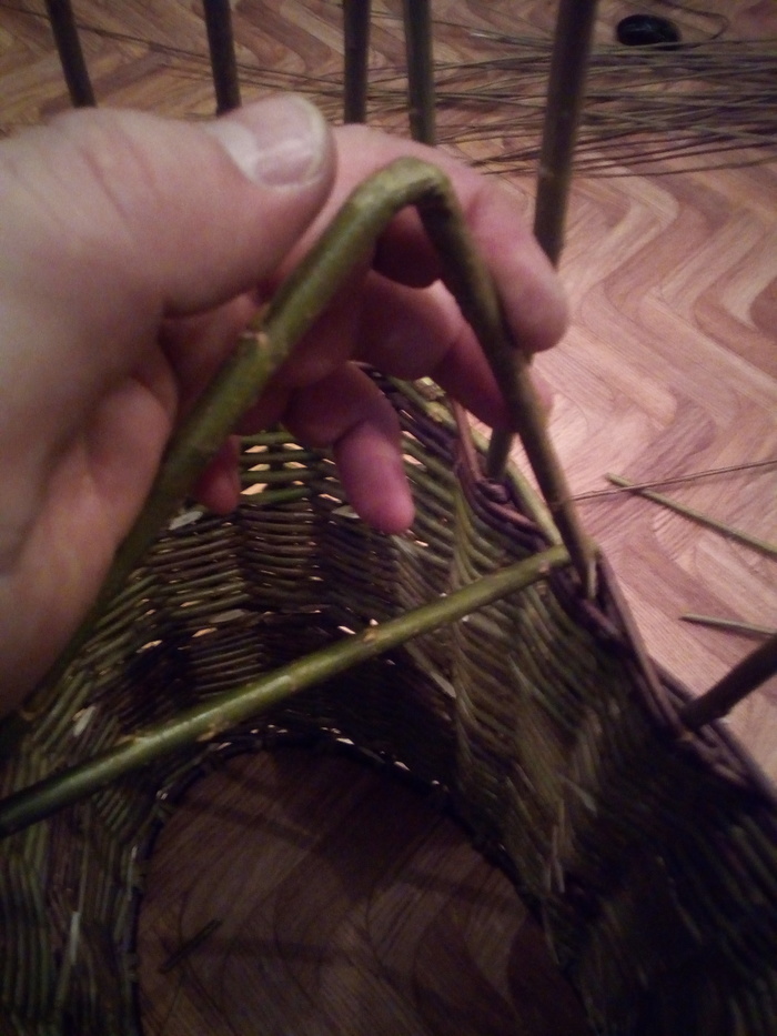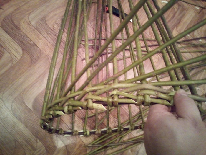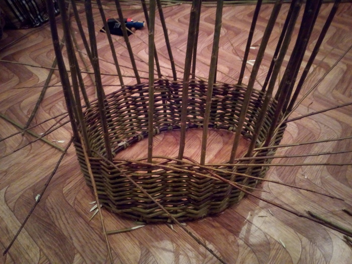 Итак, мы сплели стенки нужной нам высоты. Я за это время успел немного прибухнуть))). Теперь делаем днище. Разбиваем стойки попарно, обрезаем, загибаем и втыкаем друг против друга соответственно паре.