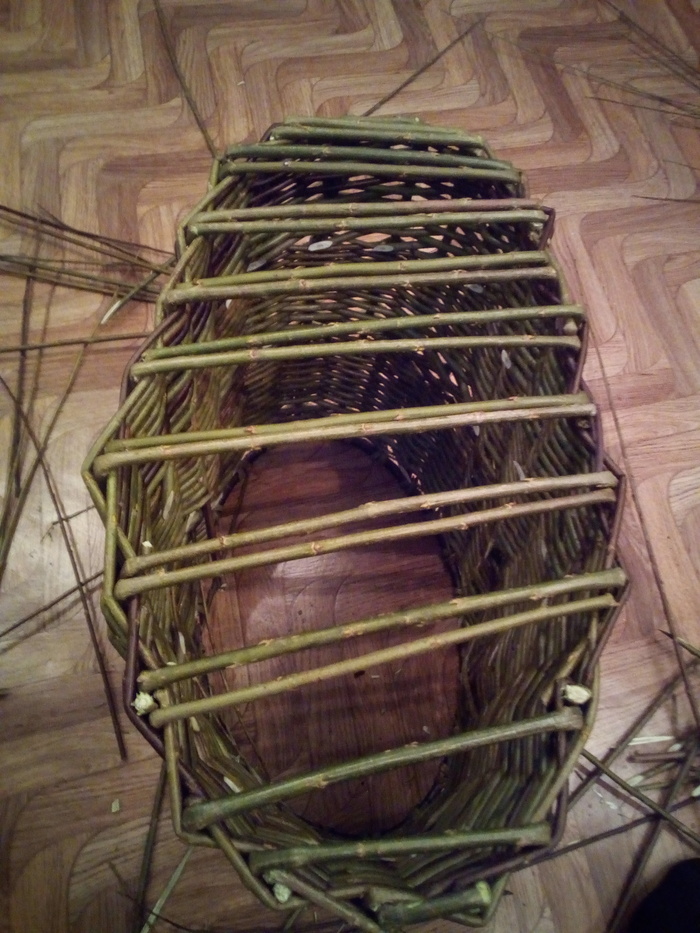 Для начала нужно запастись кучей ивняка толщиной примерно с карандаш в комле и длинной более метра, десятка три прутьев толще, чем предыдущие (для каркасных стоек), и сделать овал-основу. Бегите за ними в кусты!!! Я пока здесь подожду)))
