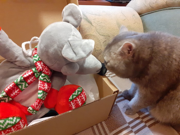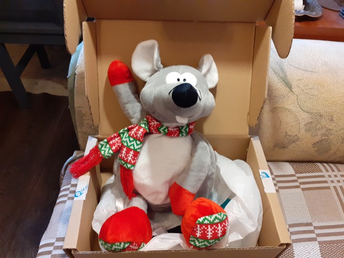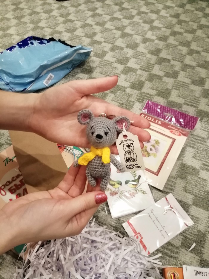 Плюшевая мыша с вкусными конфетами внутри, чай в красивой новогодней игрушке (на елочку игрушка, чай в кружку), боольшая шоколадка, магнитик из города Кобрин, и белая мышуля для моей котейки