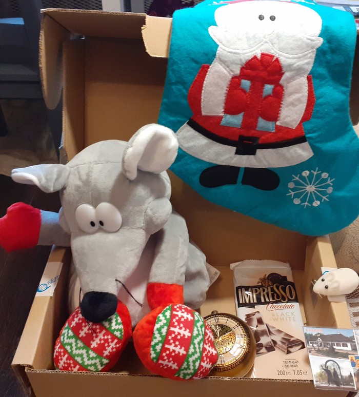 Посылочку мне прислал замечательный Дед Мороз Андрей. О себе я толком ничего и не писала, я ж не в магазине выбирать буду, а вот сюрпризы и всякие приятности люблю. Мой Дедушка порадовал Оочень. Все было как в детстве....открываешь коробочку с подарком....и чувствуешь новогодний аромат шоколадных конфет, а в добавок еще и милота внутри....