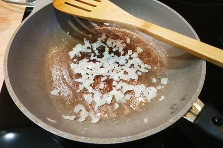 6. На сковороде потушите лук, для этого влейте немного воды и накройте крышкой, периодически перемешивайте и следите, чтобы не выкипела вся вода, и лук не пригорел. Тушите его около 7 минут, чтобы лук стал прозрачным.