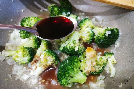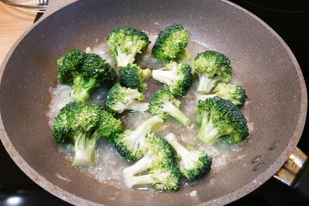 7. Добавьте в сковороду чеснок, имбирь и соцветия брокколи, влейте 60 миллилитров воды и тушите еще 5 минут. Периодически перемешивайте.