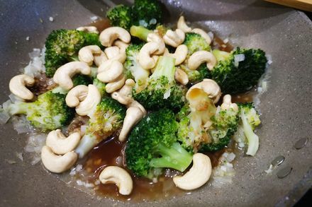 9. Следом за соусом всыпьте орешки кешью и тушите еще 3 минуты. Зажарка из кешью и брокколи готова. Орешки должны быть жареные. Если у вас простые орехи, то прежде чем готовить зажарку, их нужно перебрать, т.е. удалить испорченные, вялые экземпляры, хорошенько промыть проточной водой и просушить в духовом шкафу на противне в течение часа при температуре 100 градусов.