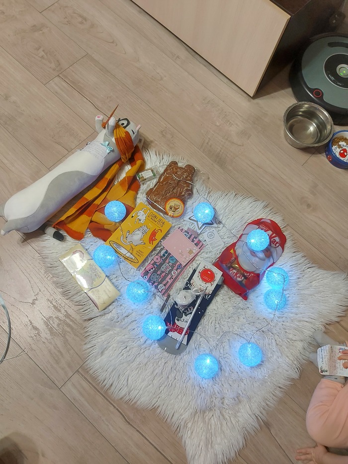 Здесь всё для меня! Как любителю Гарри Поттера и кошек - подушка-кошка-Гарри, ежедневник с котами, косметичка с котами, носки с собаками(шучу, с котами), ручка с кошкой, звездочка на ёлку, конфеты ( я сразу открыла) и гирлянда, в которую мы сразу вставили батарейки и включили ( боже, какая прелесть!!!)