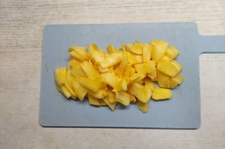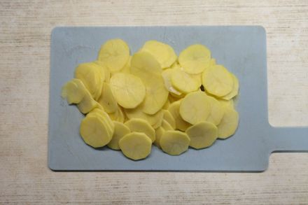 2. Пока тыква запекается, можно почистить картофель. Картофель нарезать очень тонкими дольками. Можно натереть картофель на терке.