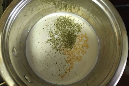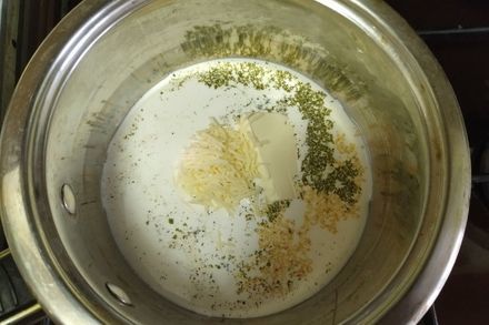 4. В небольшую кастрюлю влить два стакана жирных сливок и поставить на средний огонь. Добавить к сливкам тимьян, черный перец и мелко рубленный чеснок.