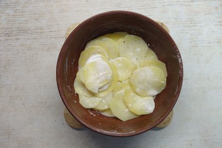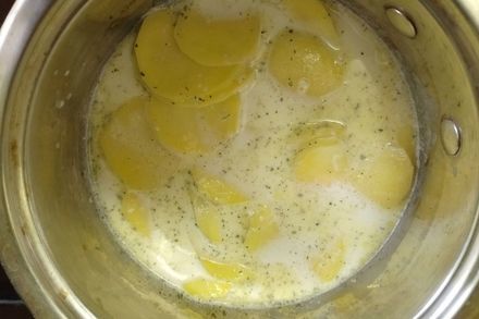 6. Переложить картофель в сливки, посолить. Довести до кипения и затем выключить газ.