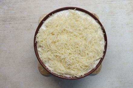 9. Затем выложить в форму оставшийся картофель и вылить все сливки. Посыпать оставшимся сыром.