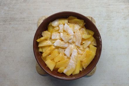 8. Поверх картофеля выложить тыкву, залить сливками и немного посолить.