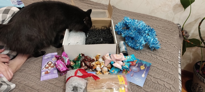 О такой внимательной Снегурочке, как у меня, можно только мечтать :) 10из10 по всему, что я указал о себе. Тут большой набор интересных специй, гора крутых сладостей (на которые сразу стали покушаться :D), гирлянда займёт почётное место на ёлке, хлопушку использую под куранты, магнит с открыткой на холодильник(первый раз получил магнит из города отправителя), а на сладкое: безумная наклонная рюмка и бутыль с шикарным егермейстером! Я постараюсь растянуть её до праздников :D