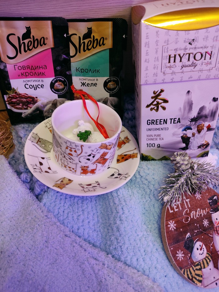 Тут и чайная пара, и вкусный чай, и новогодние красивости, и даже вкусное для кота! Но самое главное и самое ценное - это голубая тройка! Я теперь самая модная и самая утеплнная в этом промозглом городе, потому что Снегурочка прислала мне тёплые шапочку, шарфик и носочки, непередаваемо мягкие и нежные.