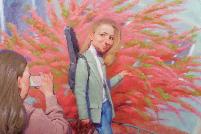 И этот простенький сюжет возник у меня давно. Но никакого четкого понимания композиции у меня не было, и даже набросок карандашом я не делал. Первоначально, я думал нарисовать вечернее, более теплое освещение. Именно в вечернее время я наблюдал как прохожие фотографируются. Но по прошествии времени, когда композиция примерно оформилась, я решил, что пусть будет "обычное" дневное освещение.