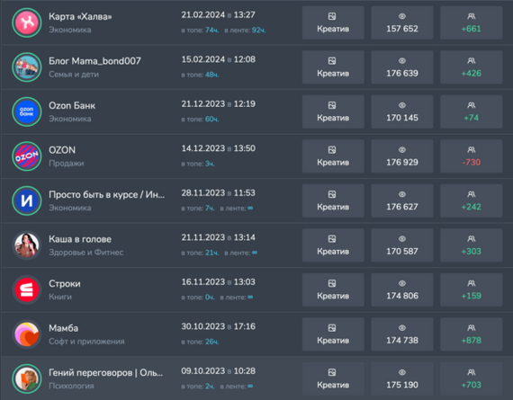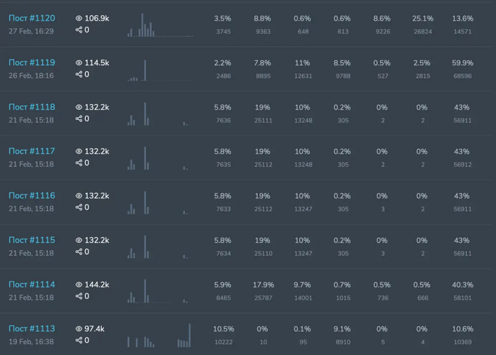 Посевы были в основном в личных блогах родителей. И вроде было все круто со стороны: личный блог, много подписчиков, десятки тысяч просмотров на пост, но подозрительно слабая активность на канале.