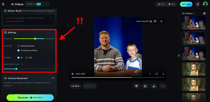 3️⃣ Генерируем видео – Переходим на Kling AI (или скачиваем приложение из AppStore). Новичкам дают 366 кредитов и несколько генераций в проф режиме (но видео длиной 5 секунд). Выбираем модель KLING 1.6 и загружаем коллаж в стартовый кадр
