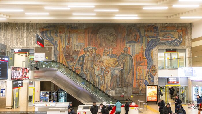 Любопытно, что изначально холл Московского Вокзала украшала Волга, Стрелка на одной стене и пара рабочего с колхозницей, на другой. Но затем пришло распоряжение сверху сделать революционный сюжет, мозаику скололи и работы начали заново.