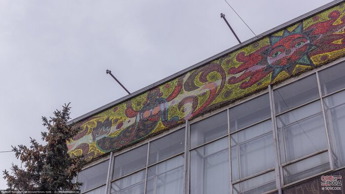 Расписной фриз на фасаде здания словно яркий мазок на холсте, целиком меняет строгий образ типового здания в духе советского модернизма и превращает его в одну из городских достопримечательностей. Орнамент из узоров под хохлому и завитки перьев жар-птицы так Ким Шихов, видел русские народные художественные промыслы и, по мнению автора, данная мозаика, одна из трёх лучших его работ.
