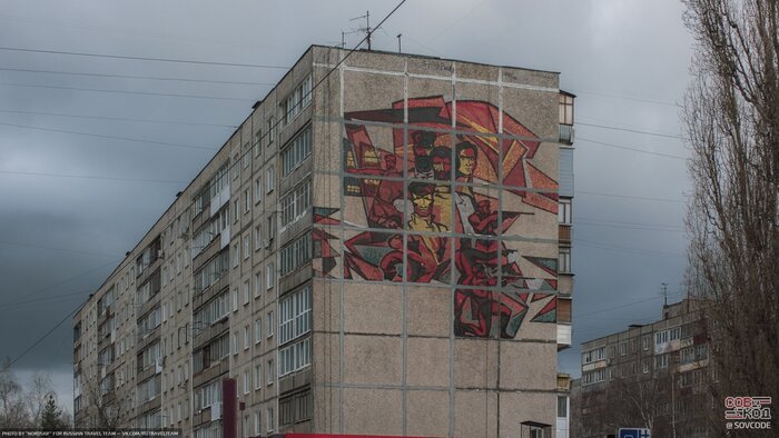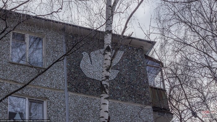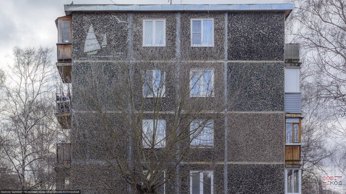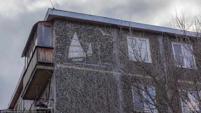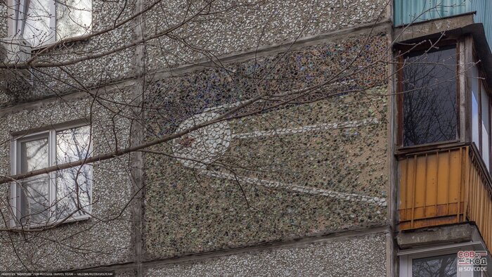 Мозаика собиралась сразу на заводе, но из-за экономии, художникам разрешили оформить всего несколько плит на каждый дом: вот такой «соцреализм-минимализм».