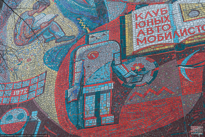 Мозаика на клубе моделирования не только занимаются всю стену, но и заворачивает за углы. Одной стены не хватило, для полной реализации художника Дмитрия Арсенина, коренного жителя автозаводского района Нижнего Новгорода. Мозаика на клубе моделирования одна из знаковых, как по уровню исполнения, так и по масштабу самого панно. По моему личному мнению, это самая интересная мозаика в «Нижнем».