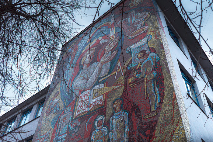 Мозаичный диптих на фасаде промышленно-технологического техникума