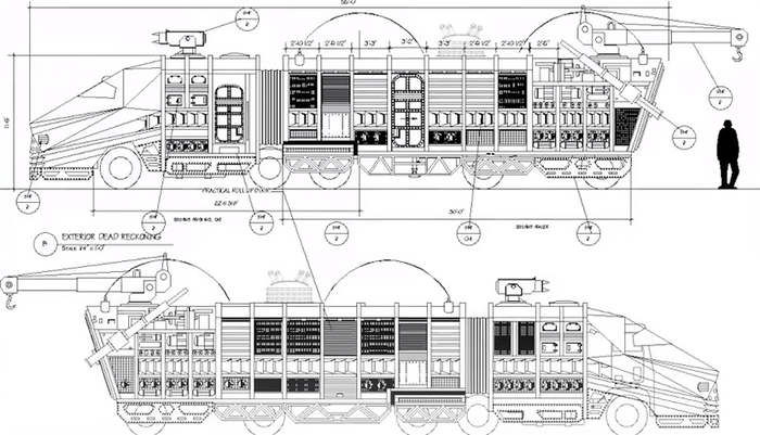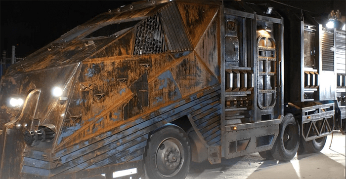 В движение экранный броневик приводился 400-сильным двигателем Detroit Diesel объемом 12,7 литра. Дизайн же грузовика разработал канадец Руди Браун, работавший также в таких проектах, как «Халк» и «Тихоокеанский рубеж». Но сотрудники BFX создавали только внешнюю часть корпуса – съемки в салоне броневика проводились в отдельных павильонах.