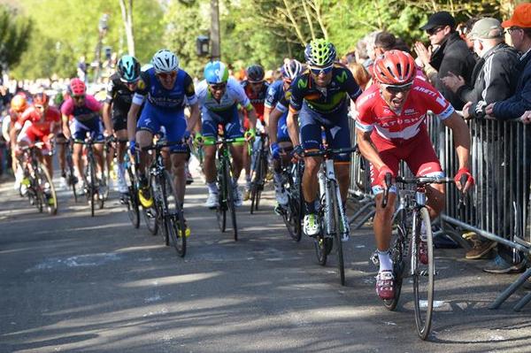 Позади же, в основной группе в голове сразу выстроились команды двух претендентов на победу. Movistar (в синем) работал на Алехандро Вальверде, а Катюша (в красном) поддерживала Хоакима Родригеса, который на Флеш Валлонь является фаворитом вне зависимости от формы. Эти два коллектива диктовали темп с начала и до конца гонки.