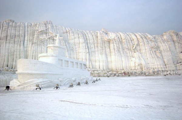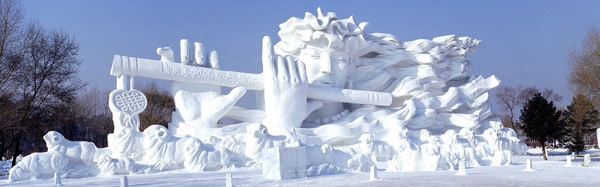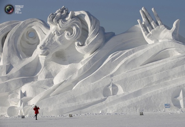 Фантастические скульптуры из снега и льда в Харбине неоднократно вносились в Книгу рекордов Гиннеса, так как поражали своим великолепием даже видавших виды специалистов. Но в памяти всегда останется огромнейшая фигура, выполненная из 2-х частей и изображающая «Пересечение Берингова пролива», а также «Ниагарский водопад». Ее длина достигала 250 метров, при высоте в 9 метров. А всего на ее сооружение пошло прядка 13 000 м³ снега.