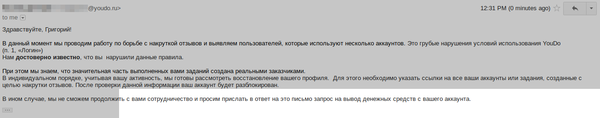 Я делаю предположение, что Юду таким образом "чистит" сервис от "фейковых" аккаунтов исполнителей (прикрепляю текст письма от сервиса) или это внутренний сбой автоматики системы, который привёл к массовым блокировкам аккаунтов исполнителей, для меня не имеет значения, что послужило причиной бана моего аккаунта.