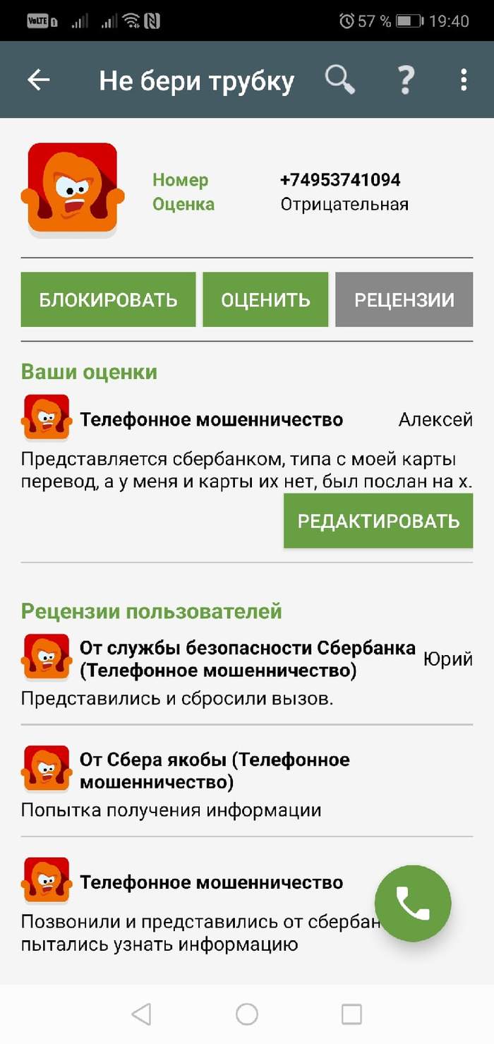 Настырный молодой человек сообщил мне, что с моей карты сбербанка 7 минут назад сделан перевод клиенту Альфа-Банка в размере 1500 рублей. "Вы ли это сделали? "- задал он мне вопрос. "Конечно я"- говорю. Он слегка удивляется, но говорит: "Фамилия, имя, отчество, кому вы переводили деньги?". Говорю "Диктую, пиши по буквам : "И-д-и на Х-у-й... Всё записал?" Ну и повесил трубку. Молодой человек не робкого десятка, даже перезвонить пытался, я отвечать не стал.