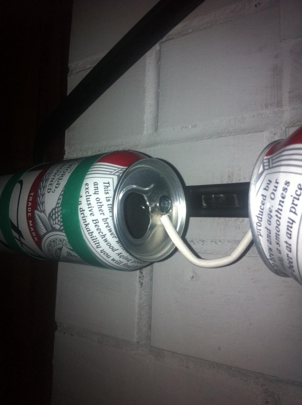 Бахнул одну банку. На вешалке ножиком сделал две отметки, расстояние между которыми составило 75мм. Зачистил 100мм кабеля. Бахнул вторую банку. В обе банки наживил шурупы. Прикрутил изолентой по заранее намеченным отметкам банки, расстояние между ними составило повторю 75мм. Прижал кабель шурупами.