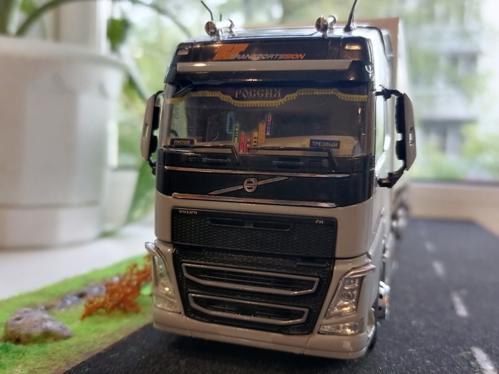 модель грузовика представлена в масштабе 1:43 от французской фирмы Eligor, Volvo FH4 500 Globetrotter c полуприцепом "TRANSPORTS SION" 2020