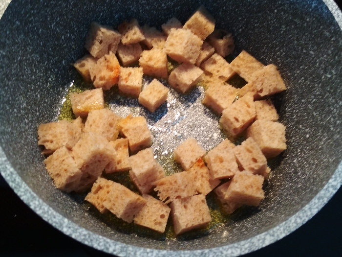 Хлеб нарезать на кубики размером примерно 1 см. и обжарить в чесночном масле. Переложить хлеб в тарелки к чесноку.