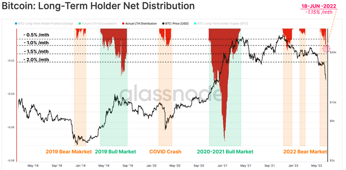 Под давлением негативных тенденций когорта долгосрочных держателей (LTH) за последнюю неделю сократила совокупные запасы на 1,3% или 178 тыс. BTC. Скорость расставания с монетами превышает показатели 2018-19 гг., однако ничтожно мала в сравнении с распродажами, устраиваемыми во время бычьих забегов. Несмотря на нереализованные убытки, LTH в основной своей массе остаются с Bitcoin.