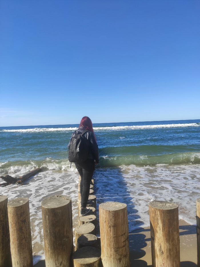 Слева будет пляж, а по правую сторону стоят брёвна, чтобы не смывало в воду песок, выглядит это своеобразно. Но море всё равно красивое. Также здесь есть ресторанчики с морепродуктами. Мы отправились в Дом моряка.