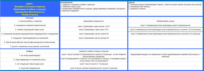 - угрозы были нейтрализованы путем разработки соответствующей финансовым и понятийным (что клиент хотел бы получить за свой бюджет) возможностям клиентов новой продуктовой линейки. Были созданы различные "пакеты" услуг, в том числе тестовые, чтобы клиент сразу не тратил значимый бюджет, а смог бы попробовать наши услуги за небольшие деньги или выбрал пакет, который максимально подходил бы его бизнесу. Была разработана и внедрена система по обработке отзывов и обратной связи наших клиентов, как для текущей работы, так и для предоставления таковых кейсов потенциальным клиентам.