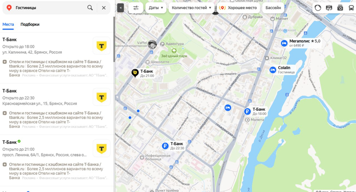 По другим городам АНАЛогично. Везде банкоматы Т-банка идут на первых местах в выборке по гостиницам на картах Яндекса. Если приглядеться, то под "карточкой" видно, что это реклама. И в самой "карточке" что-то про гостиницы написано - заказ или кэшбек. Но всё равно это такое пидорство, что даже слов нет. Цензурных.