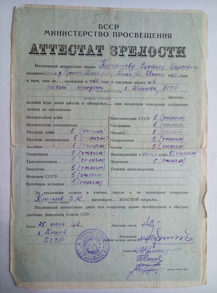 По приезду со службы В. М. поступил в вечернюю школу в г. Могилеве. Женился, пошел работать на металлургический завод. Далее по рекомендации брата работал в ж/д больнице механиком. Окончил вечернюю школу с золотой медалью и поступил в Технологический Институт.