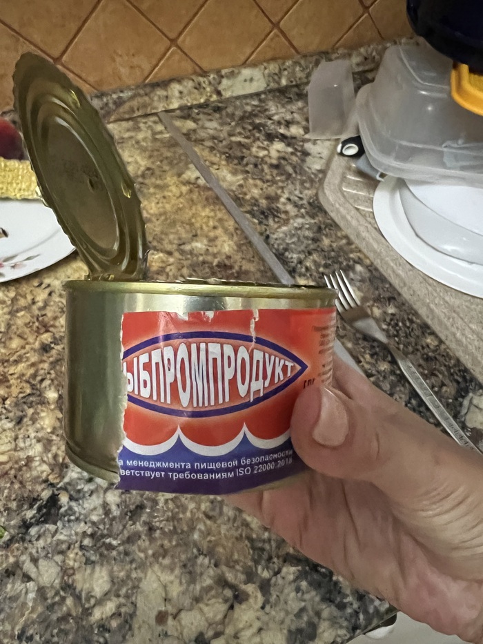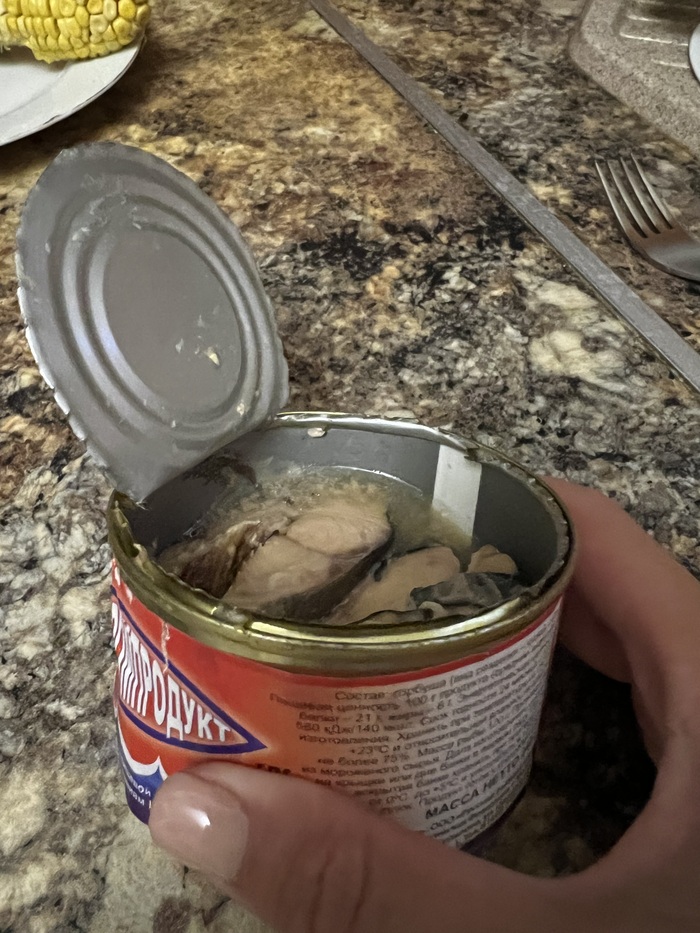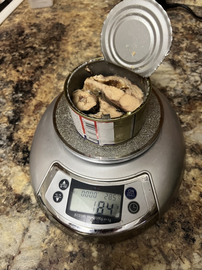 А там полбанки рыбы 🧐…. Взвешиваем с рыбкой, пустую тару, возмущаемся… читаем этикетку