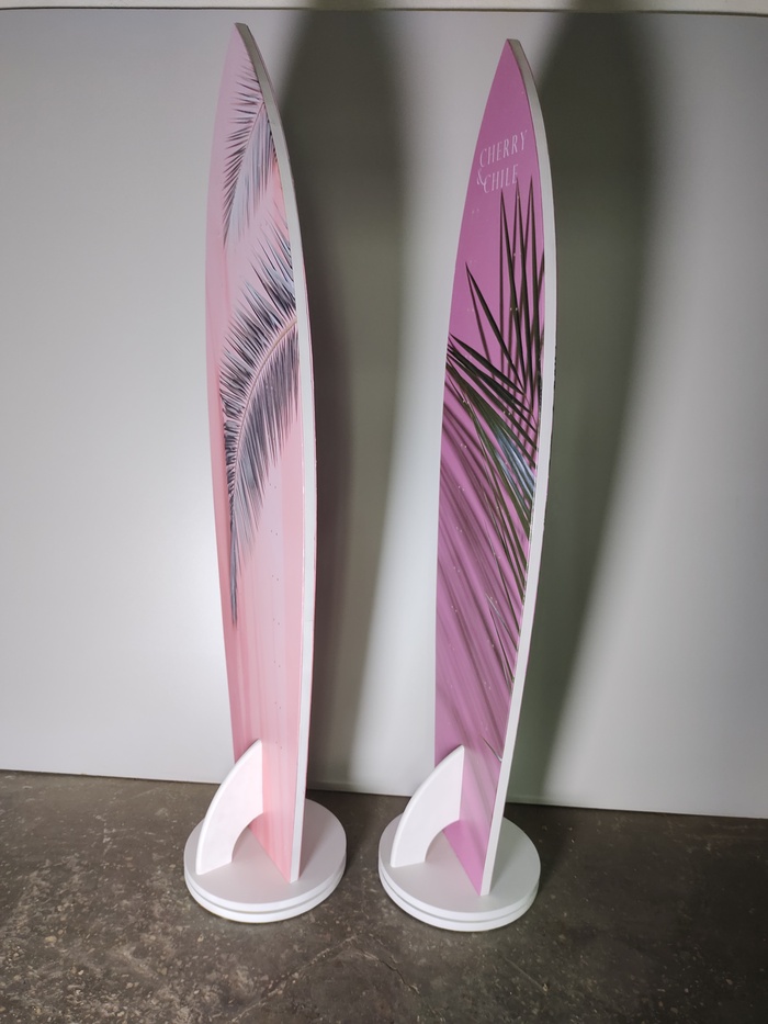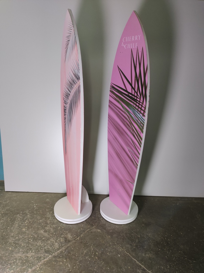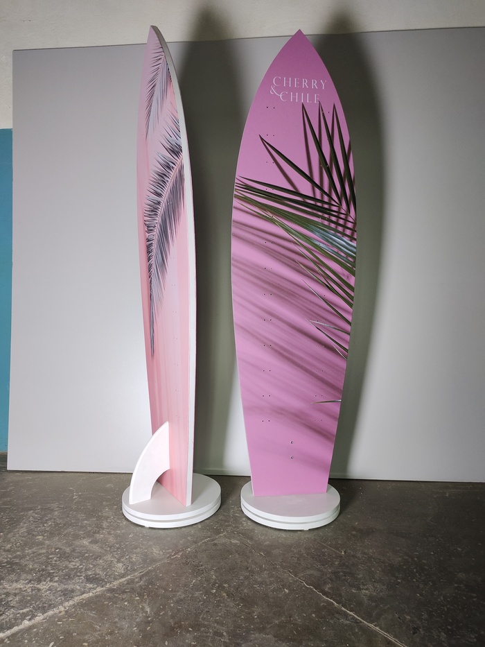 Стенд для очков в виде досок для серфинга 1800 высота 500 ширина. Печать и 2 слой ламинация, рисунок выбран заказчиком. На поворотном основании, перфорация под крючки с обоих сторон.