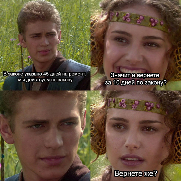 В салоне меня уже узнают все сотрудники, и когда я прихожу, мне даже ничего говорить не нужно. На месте мне сообщают, что ответ по претензии пришел, и мне одобрили возврат. То есть одобрили, да? Всё по закону, говорите? А ничего, что по закону вы обязаны вернуть мне деньги, и ничьё одобрение для этого мне не нужно?