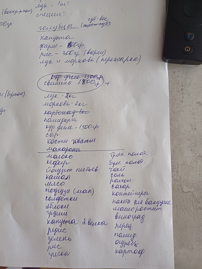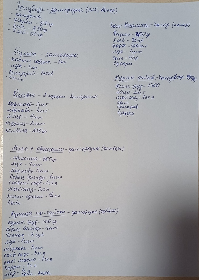 Теперь, по этому меню смотрю что у меня есть и что ещё нужно докупить. Обязательно подсчитываю количество продуктов, необходимое для рецептов.