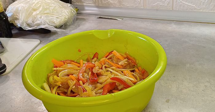 Перец, лук и морковь нарезаю так же соломкой. Такая нарезка для этого блюда идеально подходит, поэтому если вдруг будете готовить, то лучше не менять форму нарезки а оставлять соломку.