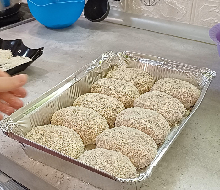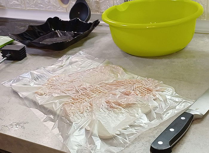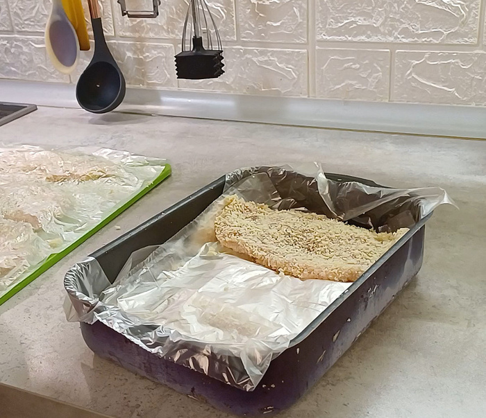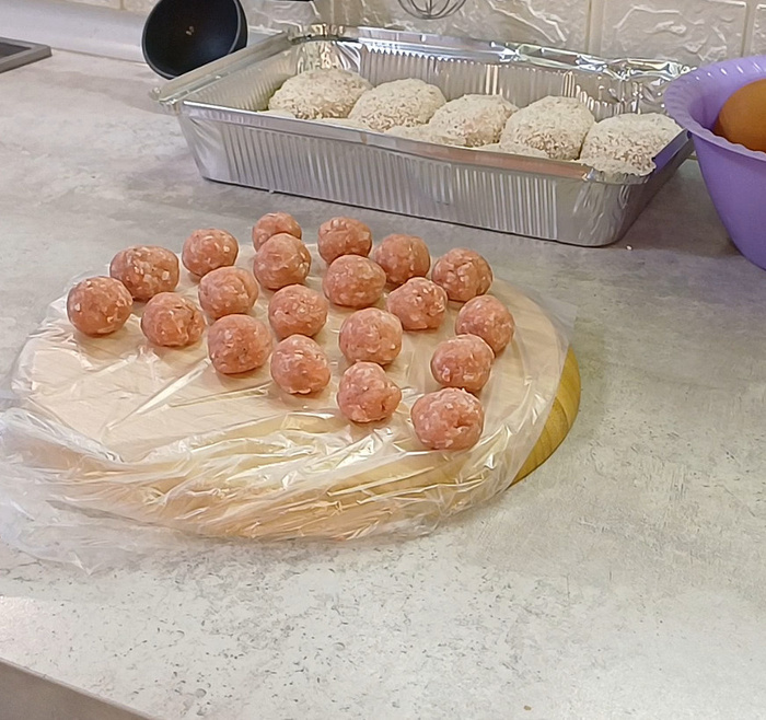 Котлеты складываю в противень, накрываю пленкой и убираю в холодильник, их планирую готовить первыми, завтра (понедельник) на ужин.
