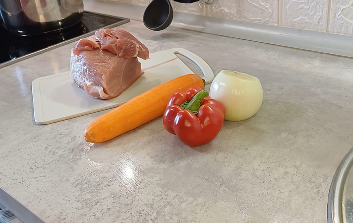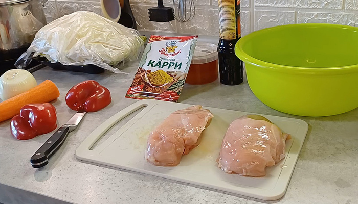 Для этого взяла 1 перец , 2 зубчика чеснока, 1 луковица, 1 морковь, куриная грудка, у меня примерно на 500 гр., приправа карри 1 ч.л, соевый соус 3 ст.л и мед 1 ч.л.