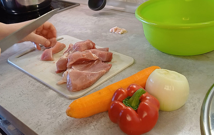 Свинина весом где-то 600 грамм, нарезаю на небольшие кубики размером как грецкий орех. В процессе нарезки если вижу жирок или пленку, сразу срезаю и убираю в сторонку.