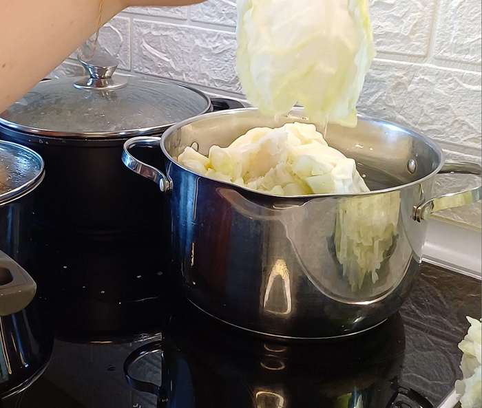Бежим обратно к плите, у нас тем временем овощи же во всю варятся. Капуста! Уменьшаю огонь на средний и переворачиваю кочан капусты. Так удобней снимать листки. Поддеваю листик вилкой и он хорошо отходит, снимаю так готовые листочки на тарелку. Если листики снимаются туго, то оставляю еще минут на 5 повариться.