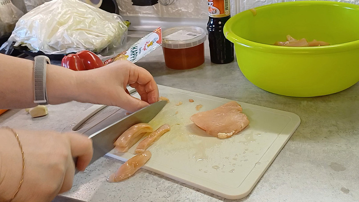 Куриную грудку разрезала вдоль на две-три пластины и нарезала на не крупную соломку. Вообще, такое блюдо я готовлю не так давно, попробовала его в гостях и знаете - мне оно понравилось такой интересный вкус.