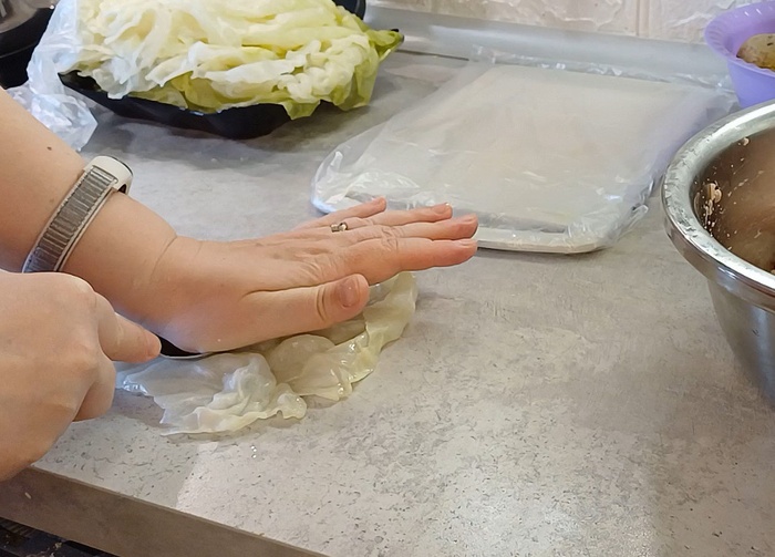 Приступаю к формированию голубцов. Беру капустный лист и кладу к себе толстым основанием и ложкой разминаю капустную венку, не знаю как точно она называется ну я думаю вы поняли.