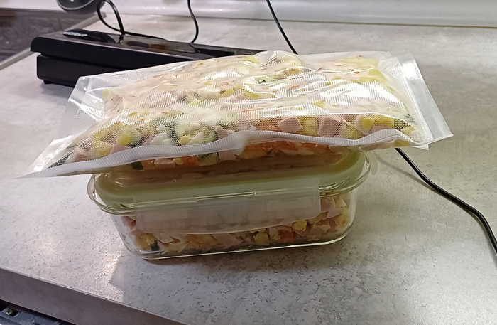 Часть отложила в миску с крышкой, остальное переложила в пакет и завакуумировала, ничем не заправляю только резаные овощи. Храню в холодильнике до 5 дней.