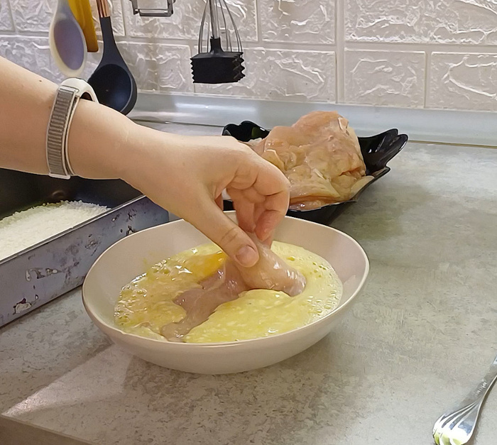 Теперь каждый кусочек грудки нужно сперва обвалять в кляре и потом тщательно с двух сторон в сухарях.