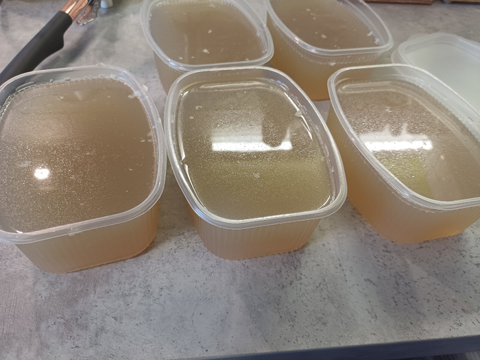 Через час выключила и оставила остывать. Процедила через сито и разлила по контейнерам. У меня вышло 5 контейнеров по 500 мл. Потом бульон развожу полутора литрами воды и готовлю супчики.